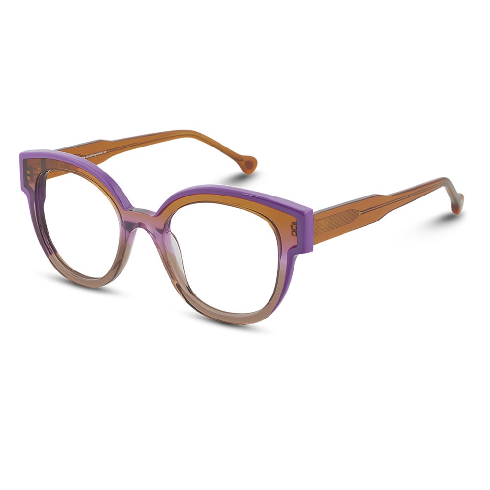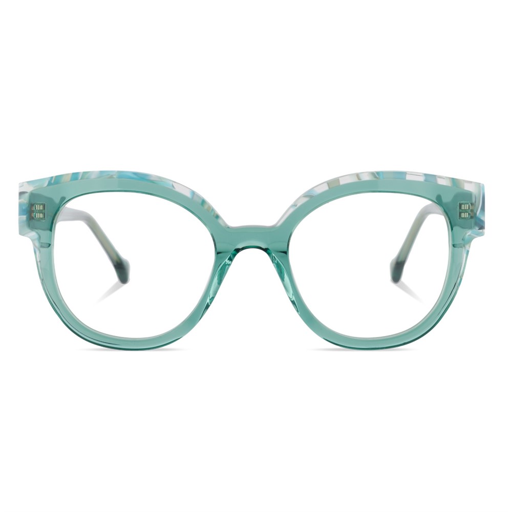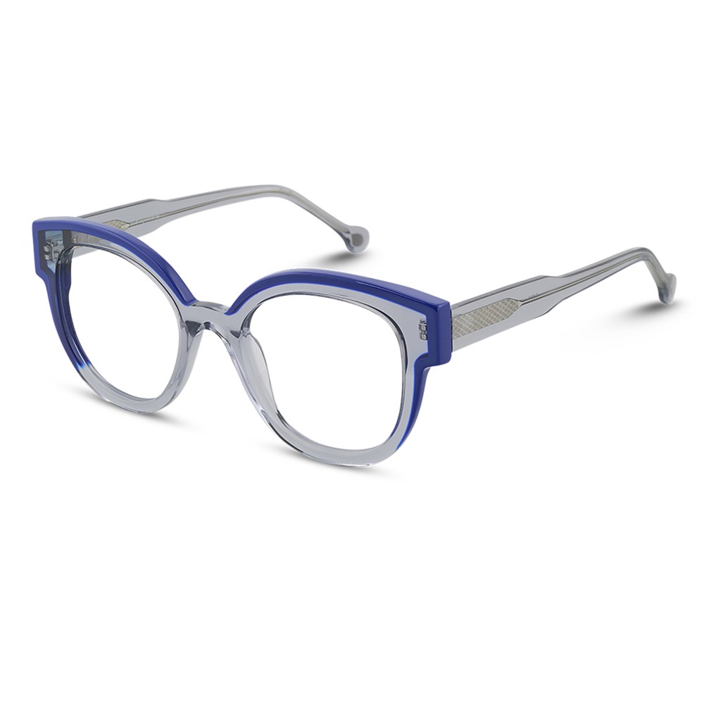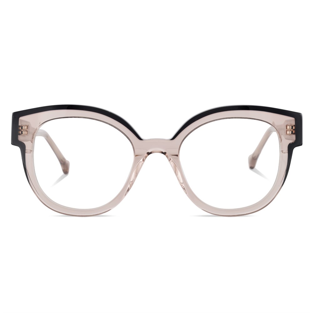 A rounded acetate frame with a straight eyebrow for a strong image.