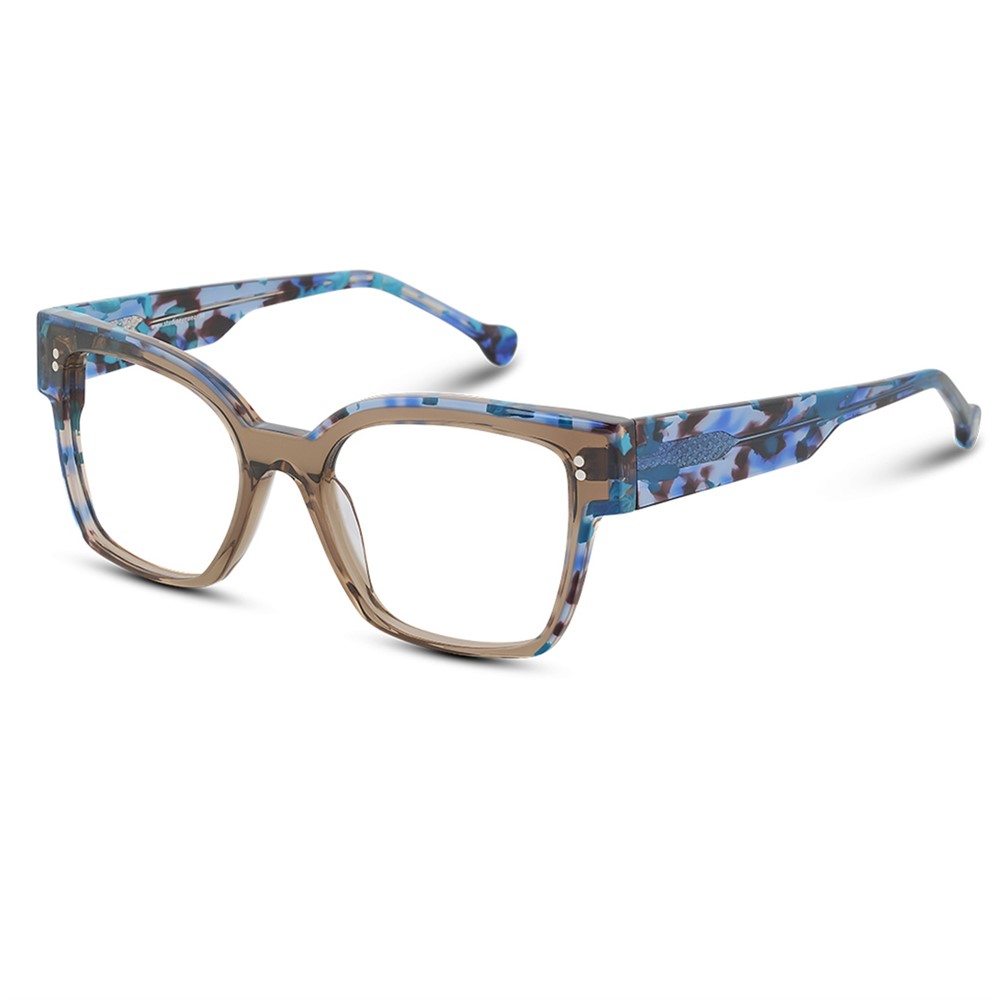 A large, extravagant, rather square acetate frame.